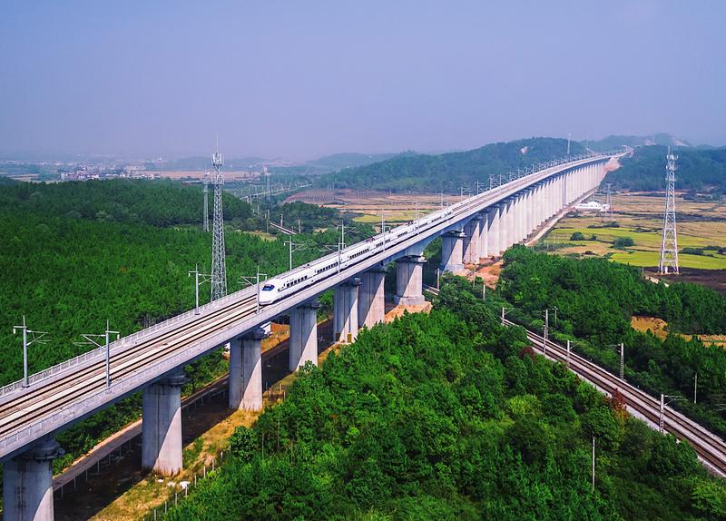 2019年12月26日上午08时18分,随着G5033次首发列车从南昌西站出发开往赣州西站,标志着由一公司历时四年多参建的中国“最红高铁”昌赣高铁正式开通运营。井冈山革命老区、赣南等原中央苏区迈入高铁时代,江西省实现市市通动车。昌赣高铁全长约418公里,北起江西南昌,南至赣州,设计时速350公里,是国家《中长期铁路网规划》南北大通道,京港高铁的重要组成部分。图为列车驶过一公司承建的昌赣高铁浒岗特大桥之一瞬。