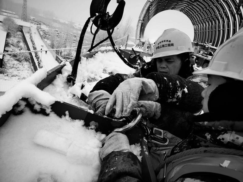 1月6日,大雪初停,京雄城际铁路的施工人员便展开了一天的繁忙施工。图为固霸特大桥全封闭声屏障工程施工现场,工人们正在起吊全封闭声屏障拱形骨架钢梁。