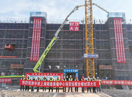 近日,沪通铁路站房工程项目集装箱中心站货运综合楼顺利封顶。 陈蒙/摄影报道
