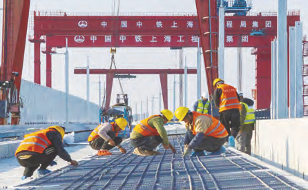 在沪宁合高铁启东特大桥施工现场,工人正在进行无砟轨道底板部位钢筋绑扎。 孟凡琼/摄影报道