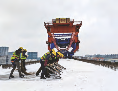 1月20日,一公司南京枢纽站前2标葛塘制梁场工人们正在清理架梁通道积雪。 段增巍/摄影报道